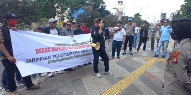 Terbentang tulisan spanduk aksi jelas terbaca ‘Desak Kapolres Depok Bongkar dan Tangkap Jaringan Pengedar Obat Keras Daftar Tipe Gevaarlijk (G) sebagai muatan New Psychoactive Substances atau Narkoba Jenis Baru.