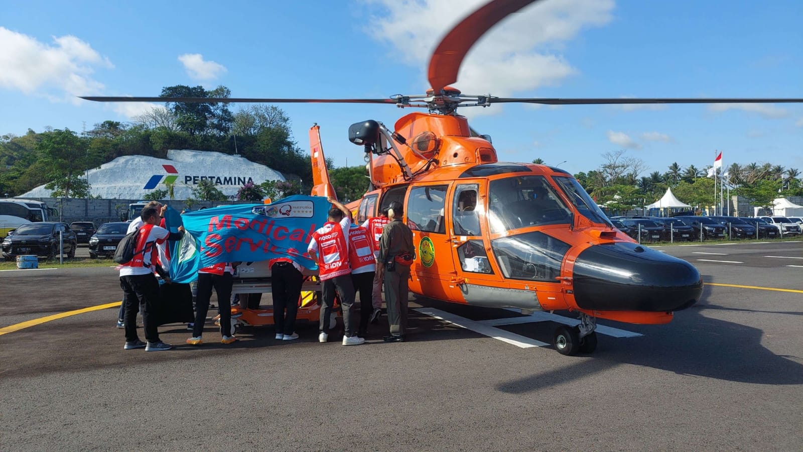 Kepala Kantor SAR Mataram Muhamad Hariyadi mengatakan, pembalap tersebut dievakuasi menggunakan helikopter jenis Dauphin bernomor registrasi HR-3604 milik Basarnas. Aktivasi layanan EMU dimulai setelah tim medis sirkuit menilai kondisi pembalap memerlukan penanganan medis lanjutan di rumah sakit rujukan.