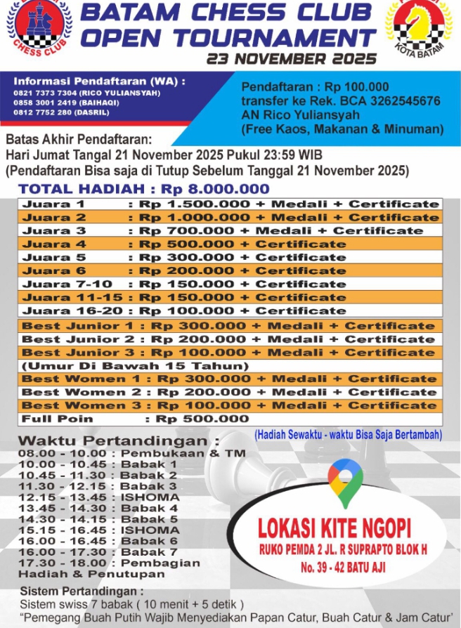 Tatgetberita.co.id Batam, BATAM CHESS CLUB (BCC) akan menggelar Open Tournament Catur dengan total hadiah sebesar Rp. 8.000.000 (Delapan Juta Rupiah) pada hari Minggu (23/11/2025) nanti.