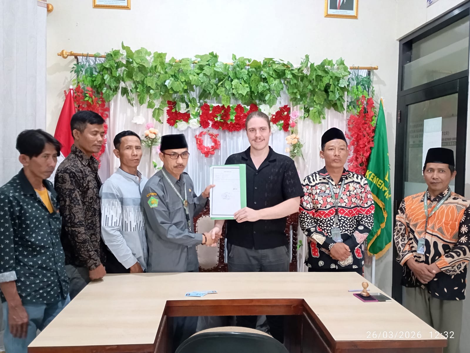 Prosesi juga dilengkapi administrasi resmi berupa penandatanganan surat pernyataan ikrar mualaf serta doa bersama.