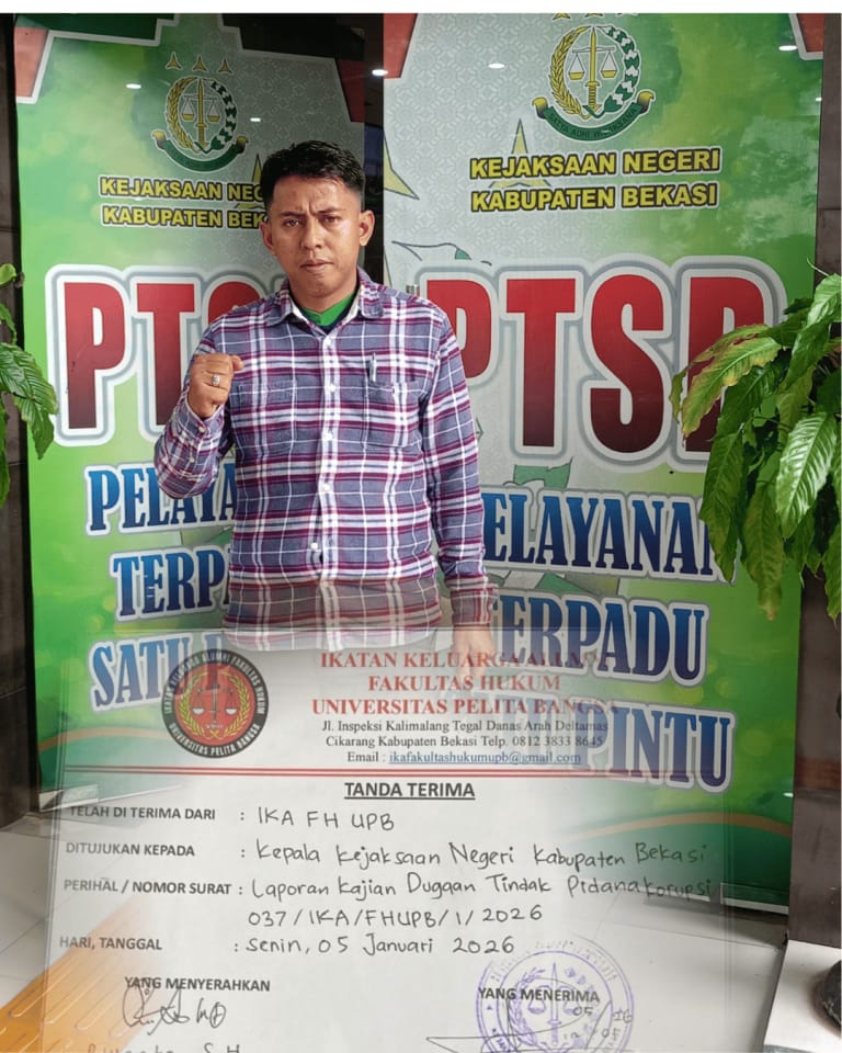 Targetberita.co.id Kabupaten Bekasi – Jawa Barat, Sekretaris Ikatan Keluarga Alumni Fakultas Hukum Universitas Pelita Bangsa (IKA FH UPB), Riyanto, S.H., resmi melaporkan dugaan tindak pidana korupsi atas berkurangnya tanah kas Desa Karang Baru ke Kejaksaan Negeri Kabupaten Bekasi.