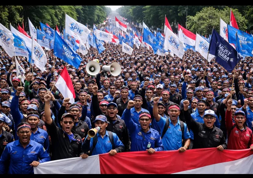 Para buruh melalui Konfederasi Serikat Pekerja Indonesia (KSPI) secara tegas menolak penetapan UMP Jakarta 2026 sebesar Rp. 5,7 juta.