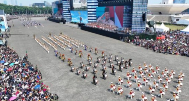 Rangkaian acara kemudian dilanjutkan dengan defile alutsista TNI, menampilkan 1.047 peralatan pertahanan modern mulai dari kendaraan taktis, artileri medan dan udara, drone, hingga kapal selam tanpa awak. Atraksi udara pesawat F-16 menjadi penutup yang spektakuler, menggetarkan langit Monas dan menegaskan kesiapan TNI menjaga kedaulatan Indonesia.
