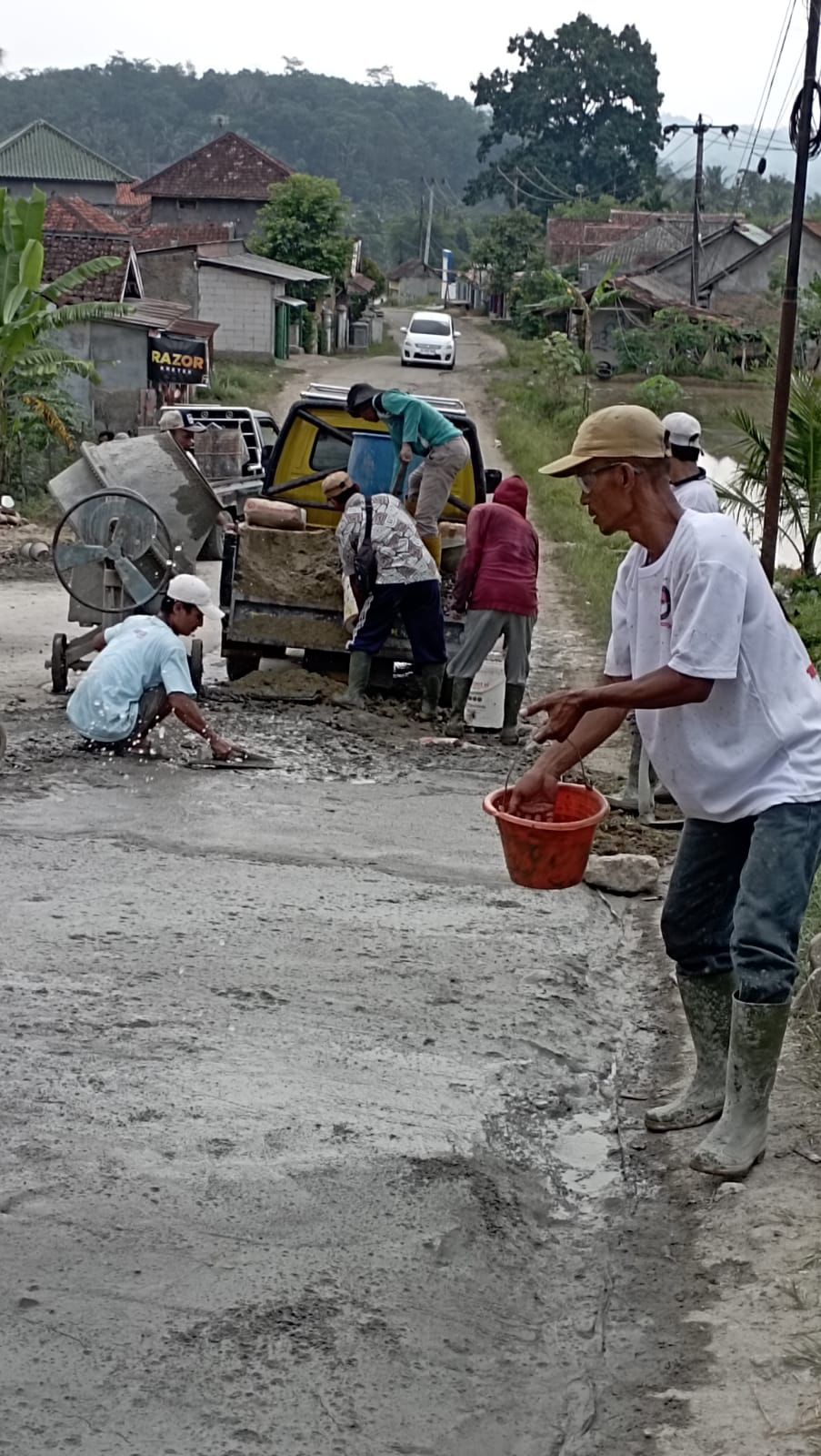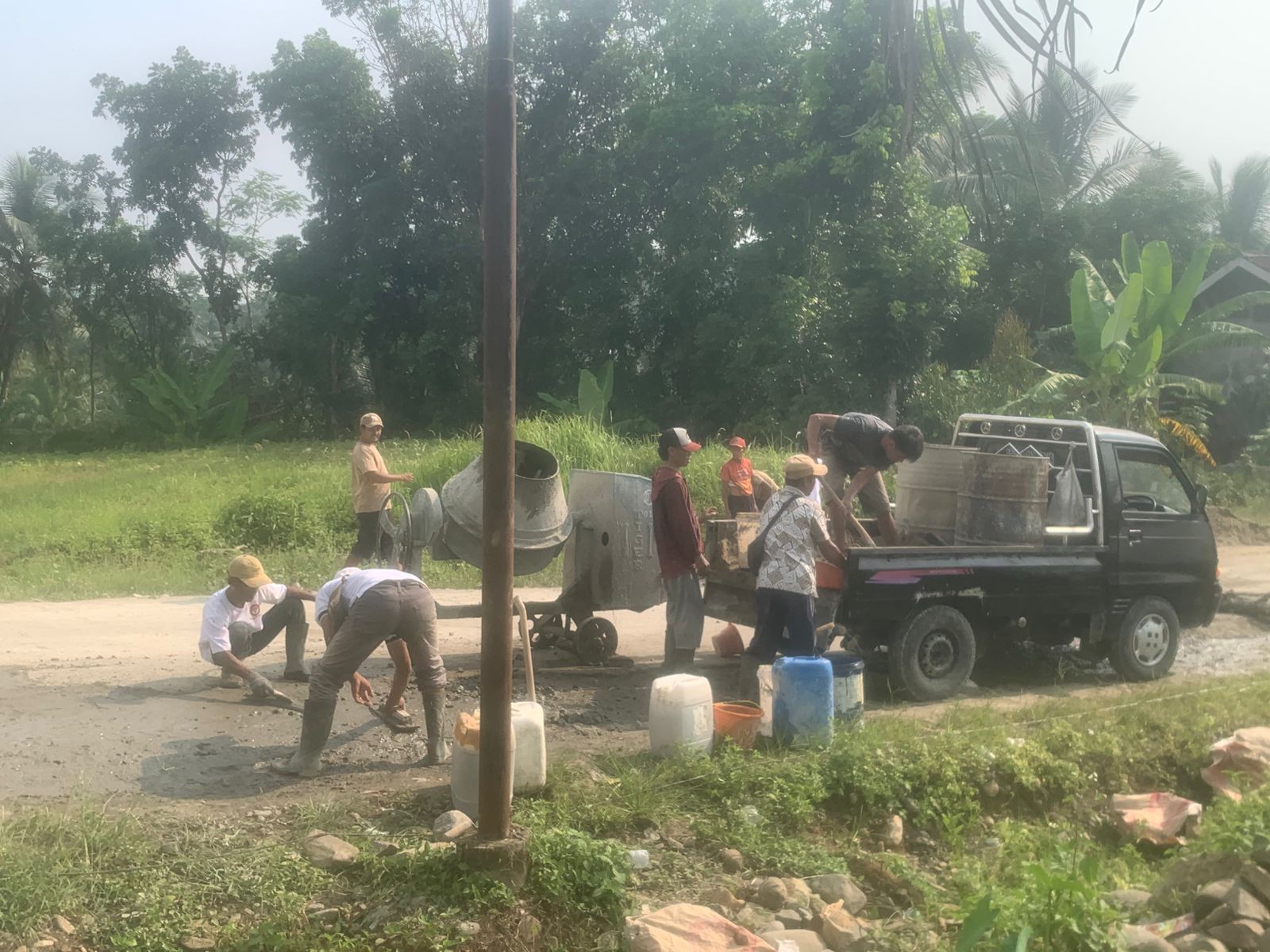Puluhan warga bahu-membahu, membawa semen, batu, serta alat sederhana untuk melanjutkan pengecoran jalan yang minggu lalu sudah ditambal.