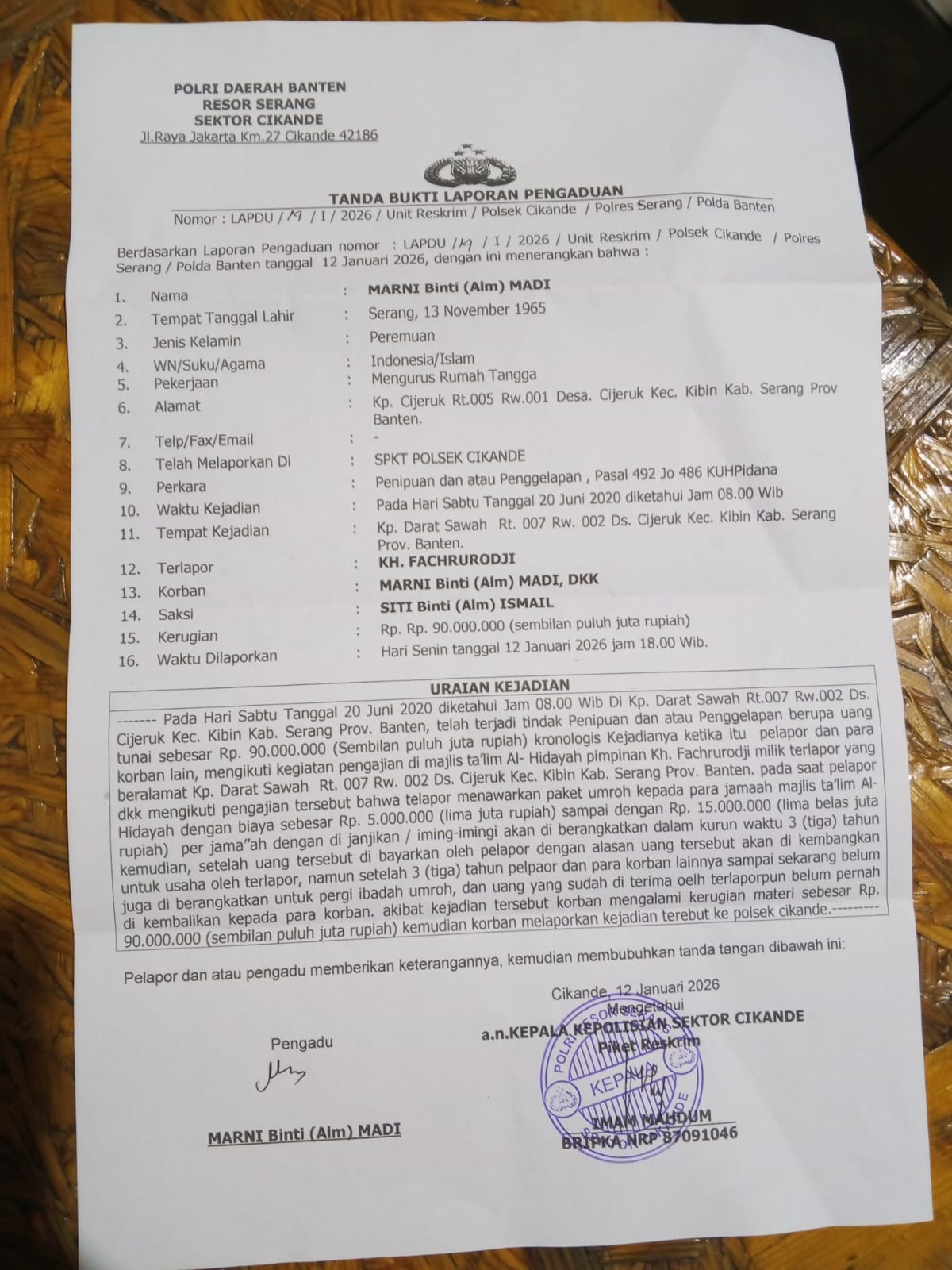 Sehubungan tidak adanya kejelasan dan keberangkatan Umroh yang tak jelas, akhirnya korban membuat laporan kepolisian.