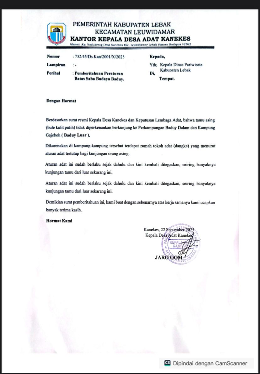 Surat bernomor 732/43/Des.Kan/2001/X/2025 yang ditandatangani oleh Kepala Desa Adat Kanekes, Jaro Oom, menjelaskan bahwa tamu asing atau bule kulit putih tidak diperkenankan masuk ke Perkampungan Baduy Dalam dan Kampung Gajeboh (Baduy Luar).