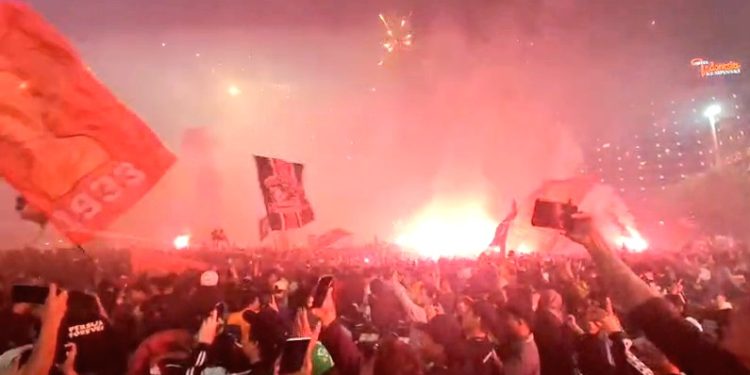 Tepat pukul 00.00 WIB, mereka langsung menyalakan kembang api, flare serta mengibarkan berbagai atribut kebanggaan. Suasana tampak meriah dengan mayoritas suporter menggunakan kaos warna orange sebagai ciri khas tim Persija.
