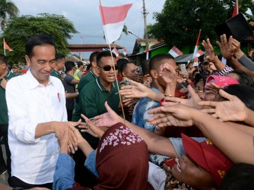 Jokowi terlihat mengenakan kemeja putih dan berbaur dengan warga. Dia didampingi Wakil Ketua Umum PSI Isyana Bagoes Oka.