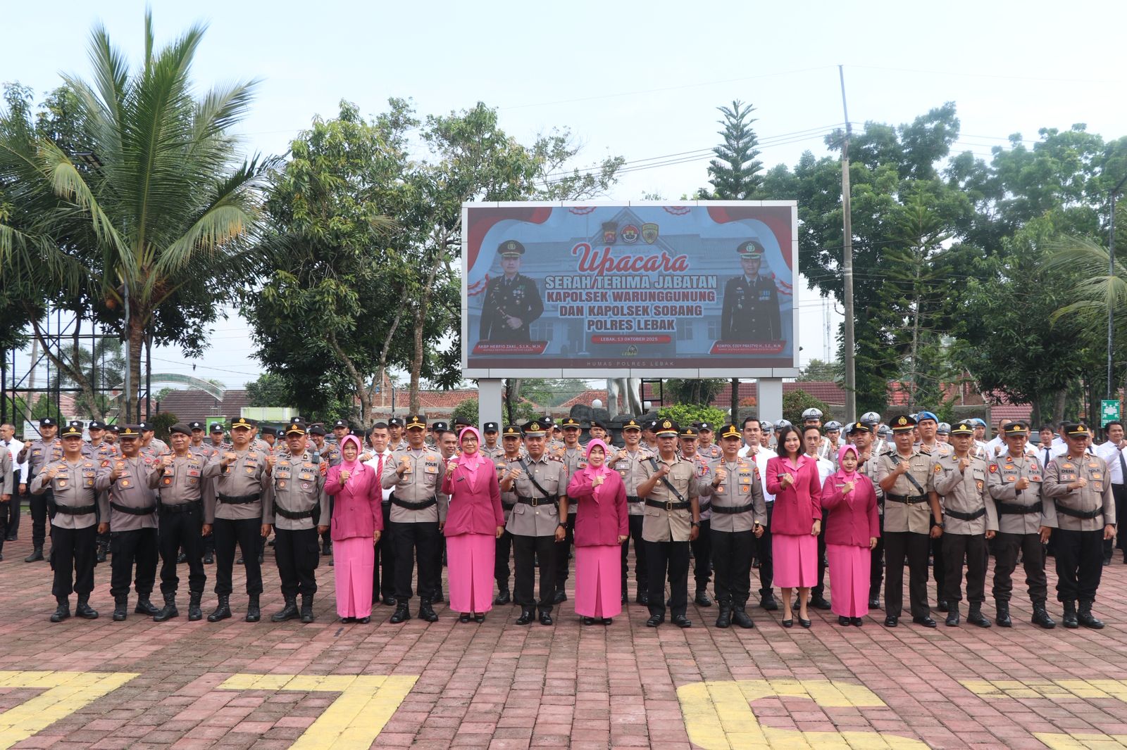 Targetberita.co.id Lebak – Banten, Kapolres Lebak Polda Banten AKBP Herfio Zaki, SIK, MH memimpin Upacara Serah terima Jabatan Kapolsek Warunggunung dan Kapolsek Sobang di Lapangan Mapolres Lebak, Senin (13/10/2025).