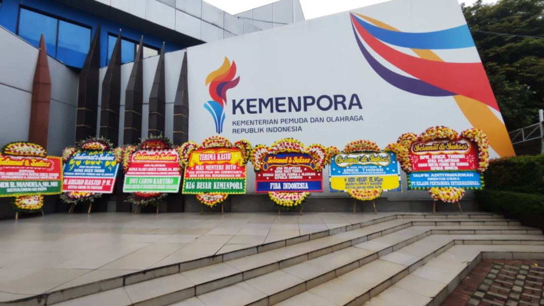 Ratusan karangan bunga berjejer rapi di halaman gedung, mengiringi momen pergantian kepemimpinan dari Dito Ariotedjo kepada Erick Thohir sebagai Menteri Pemuda dan Olahraga (Menpora) yang baru.