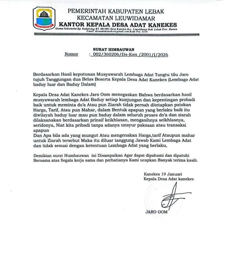 Targetberita.co.id Lebak – Banten, Kepala Desa Adat Kanekes Jaro Oom melalui surat himbauan bernomor 002/360206/Ds-Kan/2001/I/2026 yang dikeluarkan pada Senin (19/1/2026), menegaskan bahwa segala bentuk kepentingan pribadi terkait permintaan bimbingan syariat dan doa, maupun kegiatan ziarah di wilayah Baduy Luar dan Baduy Dalam tidak pernah ditetapkan patokan harga, tarif, atau mahar dalam bentuk apapun.