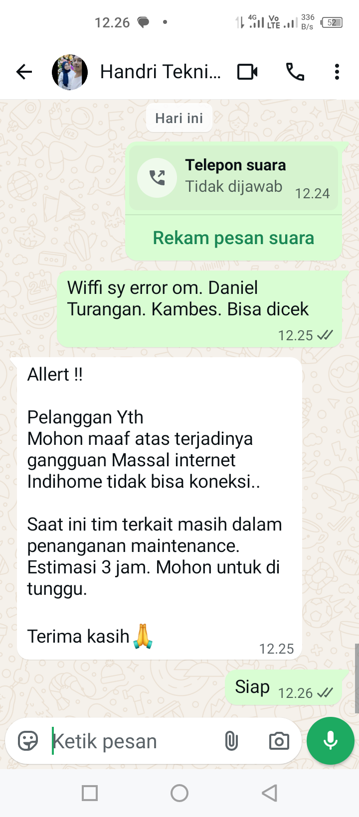 ‎” Saya sudah menghubungi teknisi Indihome dan mendapat jawaban bahwa sedang dalam perbaikan dan estimasi 3 jam, nyatanya hingga pukul 23.24 wib masih saja tidak dapat digunakan “.