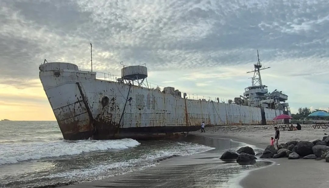“Eks kapal perang yang mempunyai panjang 100 meter, dan lebar 15 meter ini, telah bersandar hampir dua tahun di perairan Kota Pariaman, tepatnya di depan Pantai Pauh,” tulis akun tersebut.