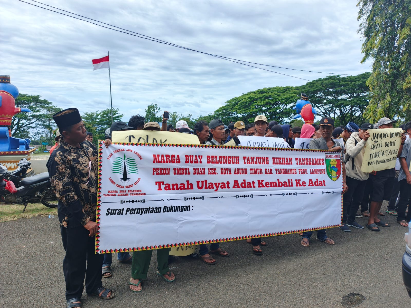 Aksi damai yang bertema “Tanah Adat Kembali ke Adat”. Berlangsung kondusif sejak pukul 9.30 hingga 10.30 WIB., dan disambut hangat oleh Wakil Bupati Tanggamus Agus Suranto.