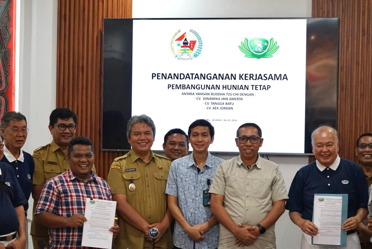 Bupati Tapanuli Utara Dr. Jonius Taripar Parsaoran Hutabarat, S.Si, M.Si bersama Wakil Bupati Dr. Deni Lumbantoruan, M.Eng dan Sekretaris Daerah Kabupaten Tapanuli Utara Drs. Henry Maraden Masista Sitompul, M.Si menyaksikan Penandatanganan Kerja Sama Pembangunan Hunian Tetap (Huntap) antara Yayasan Buddha Tzu Chi dengan 3 perusahaan pelaksana Pembangunan bertempat di Aula Mini Kantor Bupati Tapanuli Utara, Tarutung, Selasa (6/1/2026).