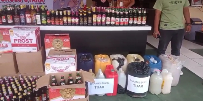 ‎Minuman Keras Sebanyak 145 botol miras berbagai merek (seperti Malaga dan Anggur Merah) serta puluhan liter minuman tradisional jenis tuak.