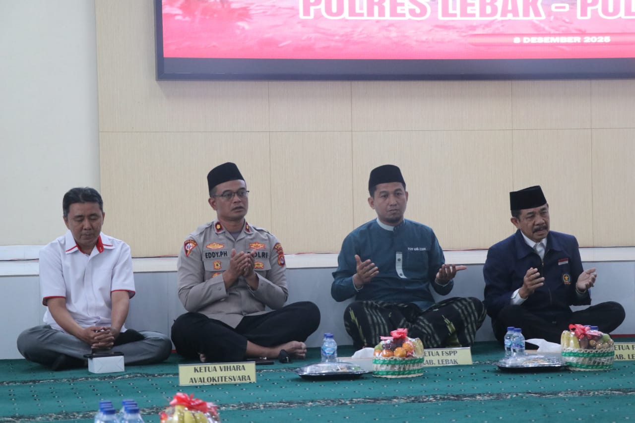 Kegiatan yang dimulai pukul 16.00 WIB tersebut dihadiri langsung oleh Kapolres Lebak AKBP Herfio Zaki, S.I.K., M.H., Wakapolres Lebak Kompol Eddy Prastyo Hermawan, S.E., M.M., Ketua MUI Kabupaten Lebak KH. Pupu Mahpudin, Ketua PCNU Kabupaten Lebak KH. Asep Saefullah, Ketua FSPP Lebak K.H.Ade Bujaeremi, Ketua BKSAG Kabupaten Lebak Pendeta Gideon, Ketua Yayasan Avalokitesara Romo Kiat Koen, para Pejabat Utama Polres Lebak, bintara dan ASN Polres Lebak, serta perwakilan organisasi masyarakat dan OKP mahasiswa.