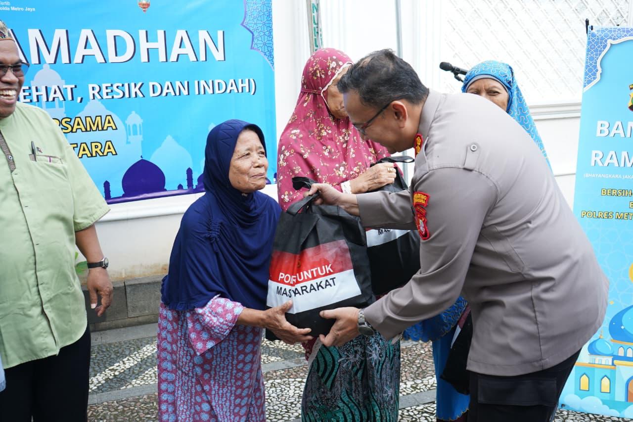 Selain kerja bakti, Polres Metro Jakarta Utara juga menyerahkan bantuan paket sembako kepada pengurus masjid dan warga sekitar sebagai bentuk kepedulian sosial menjelang Ramadhan.