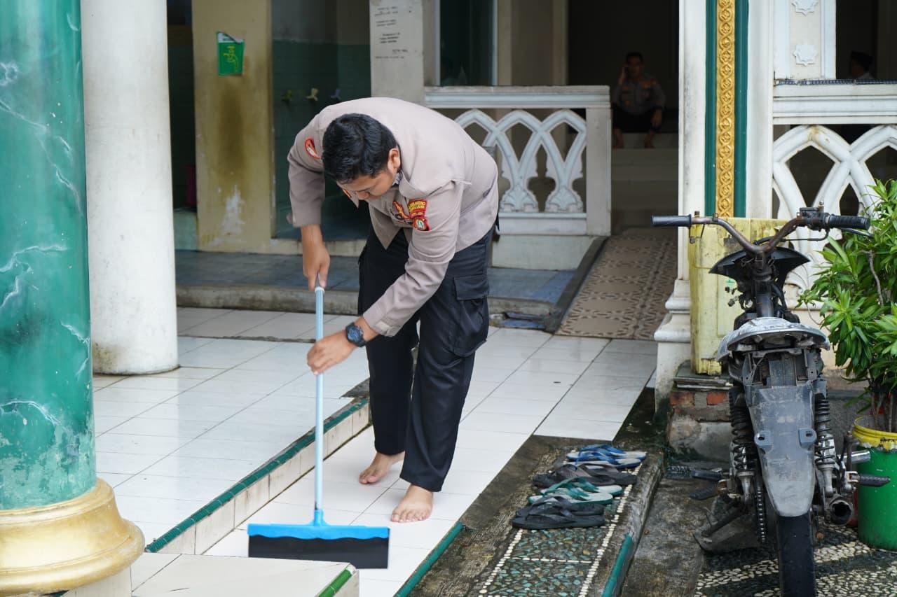 Kegiatan gotong royong tersebut menjadi simbol sinergi antara Polri dan masyarakat dalam menjaga kebersihan serta kenyamanan tempat ibadah.