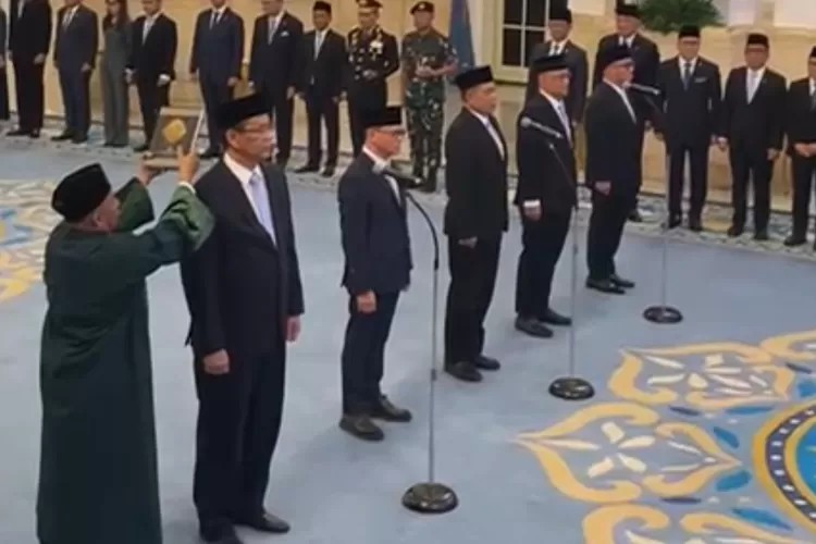 Di Istana Negara, prosesi pelantikan menteri dan wakil menteri yang baru diawali dengan pembacaan keppres pemberhentian dan pengangkatan menteri dan wakil menteri, kemudian pengambilan sumpah yang dipimpin oleh Presiden Prabowo.