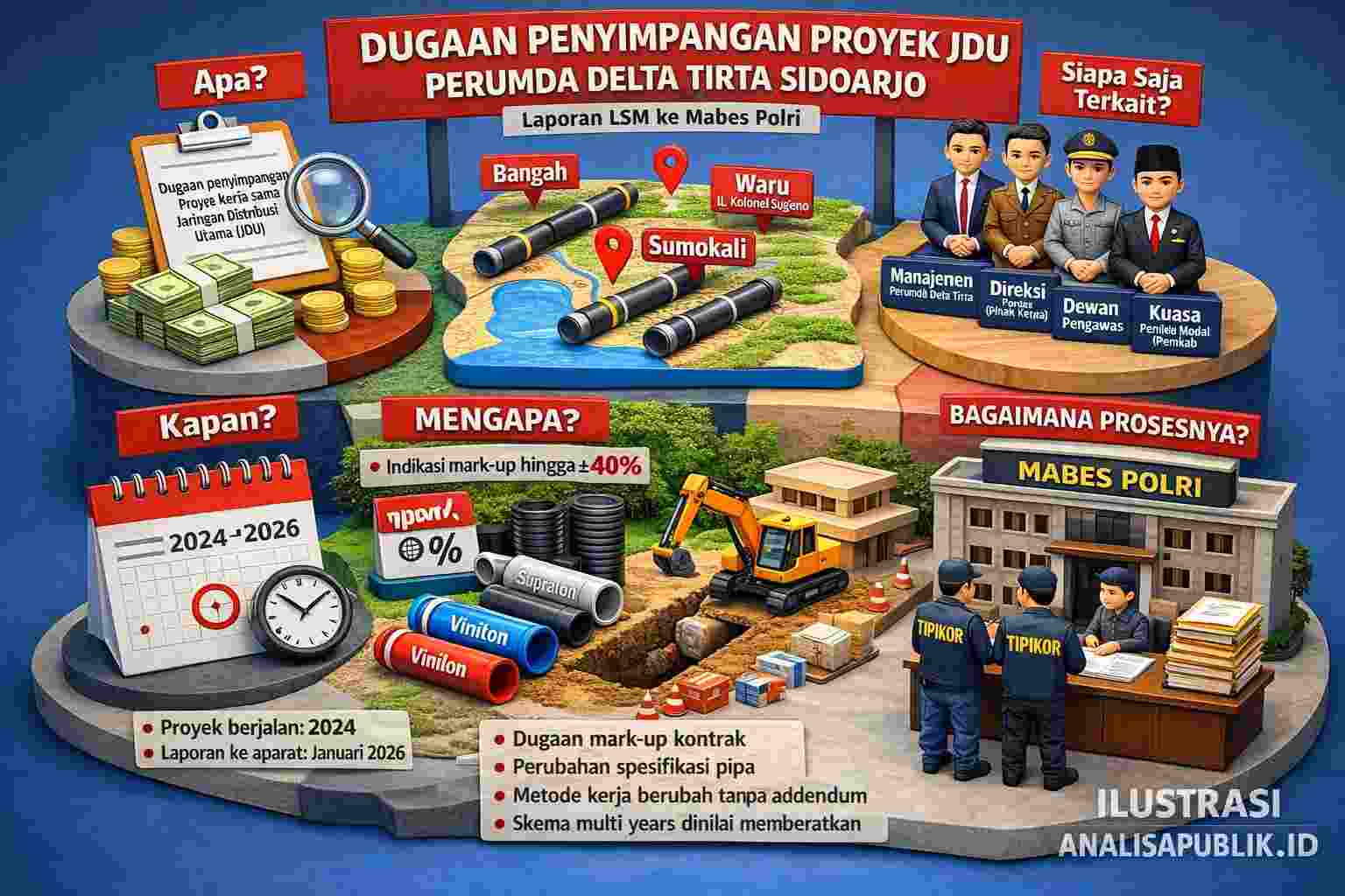 Targetberita.co.id Sidoarjo – Jawa Timur, Perwakilan Daerah Daulah Indonesia Adil Salamah (DINAS) Kabupaten Sidoarjo melaporkan dugaan tindak pidana korupsi dalam proyek Kerja Sama Investasi Pengadaan dan Pemasangan Pipa Jaringan Distribusi Utama (JDU) antara Perusahaan Daerah Air Minum (Perumda) Delta Tirta Sidoarjo dengan PT Rafa Karya Indonesia.