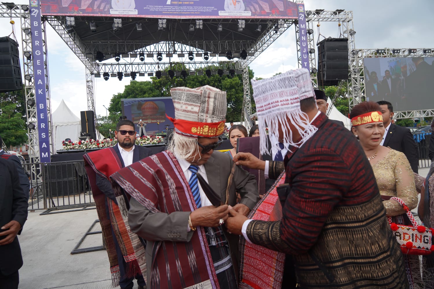 Usai pelepasan balon, dilanjutkan dengan penyerahan penghargaan (Bulang-Bulang) oleh Forkala (Forum Komunikasi Lembaga Adat) kepada mantan Bupati Toba Samosir ke 3, Pandapotan Kasmin Simanjuntak bersama istri.