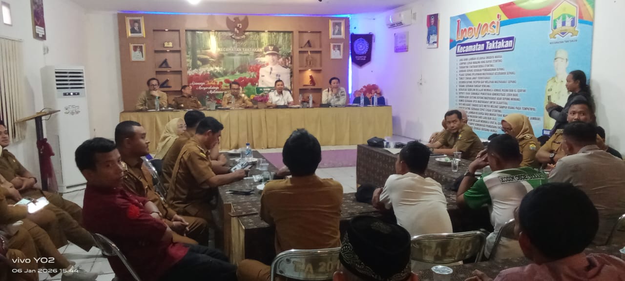 Rapat evaluasi ini dilaksanakan di aula Kecamatan Taktakan dengan dihadiri oleh Sekda Kota Serang Nanang Saefudin, Asda 1 Subagyo, Kadis LH Farach Richi, Kasatgas Pembangunan Kota Serang H. Wahyu Nurjamil yang juga sebagai Kadisperindagkop Kota Serang, Kadinsos M. Ibra Gholibi, Kadinkes dr Hasanuddin, Camat Taktakan Mamat Rahmat, Kapolsek AKP Malik Abraham, Danramil Kapt Inf Farid, para Lurah, tokoh masyarakat, RT, RW dan tokoh pemuda se Taktakan, Selasa (6/01/2026).
