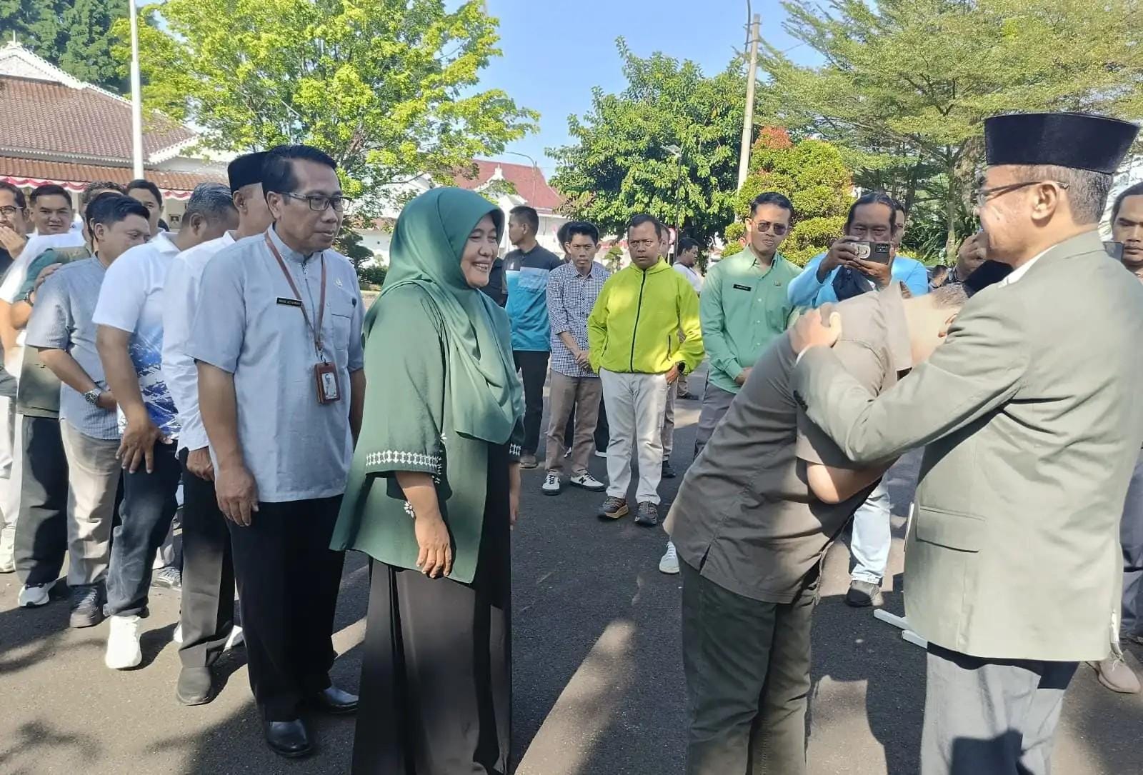 Apel pagi itu ditutup dengan momen penuh haru. Cecep meminta maaf kepada seluruh ASN, sembari bersalaman satu per satu dengan jajaran pegawai Pemkab Cianjur.