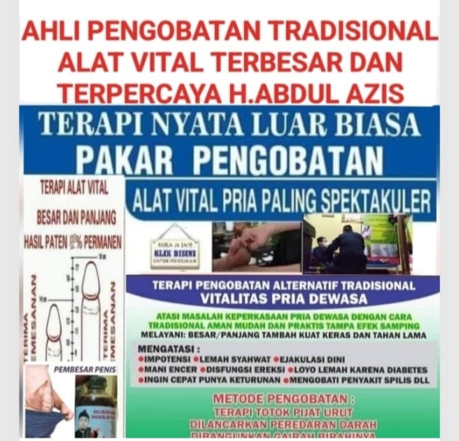 Targetberita.co.id Klaten – Jawa Tengah, Telah Hadir Terapi Pengobatan Tradisional ALAT VITAL, satu-satunya yang ada di Klaten telah banyak membantu Pasien khususnya kaum Adam yang mempunyai Keluhan Terkait Pada Vitalitas sudah menurun kurang maksimal durasi dan disini Solusinya pakar pembesar vitalitas pria yang ada di wilayah Jateng Dan Bisa Sekarang Telpon 0812 7721 7788