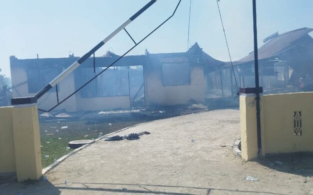 Tidak hanya melakukan aksi demo, sejumlah gedung dan termasuk Kantor Polsek MBG di Desa Singkuang, akhirnya ludes dibakar massa.