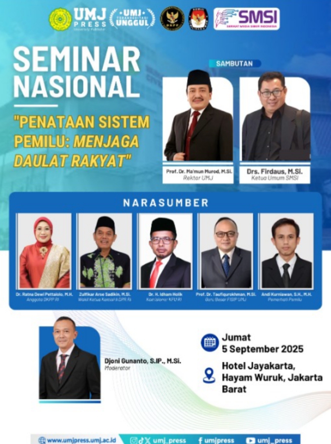 Berangkat dari realita tersebut, Universitas Muhammadiyah Jakarta (UMJ) pada Jumat, 5 September 2025 mendatang akan menggelar Seminar Nasional bertajuk “Penataan Sistem Pemilu Menjaga Daulat Rakyat” di Hotel Jayakarta Hayam Wuruk, Jakarta.