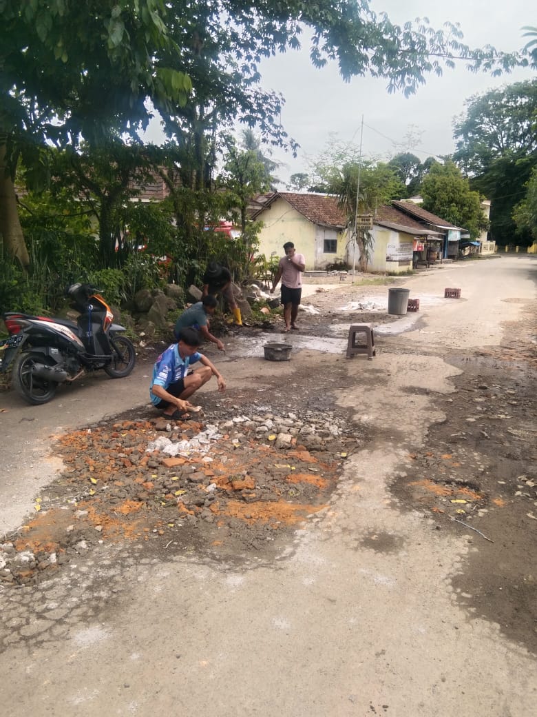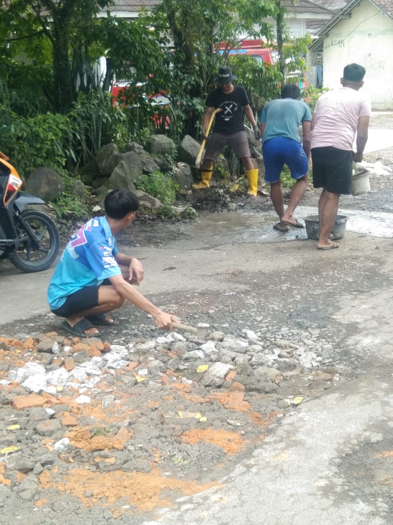 Mereka bergotong royong memperbaiki jalan dengan cara menambal lubang menggunakan material batu dan semen seadanya.